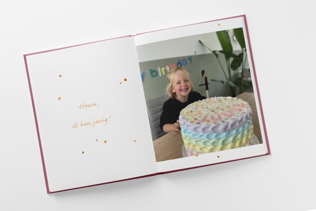 Bij het maken krijg je opdrachtjes en inspiratie. Jij hoeft alleen je foto’s erin te slepen. Om je te helpen bij de fotoselectie laten we bij de foto’s zien hoe oud je kind toen was. Wel zo makkelijk!